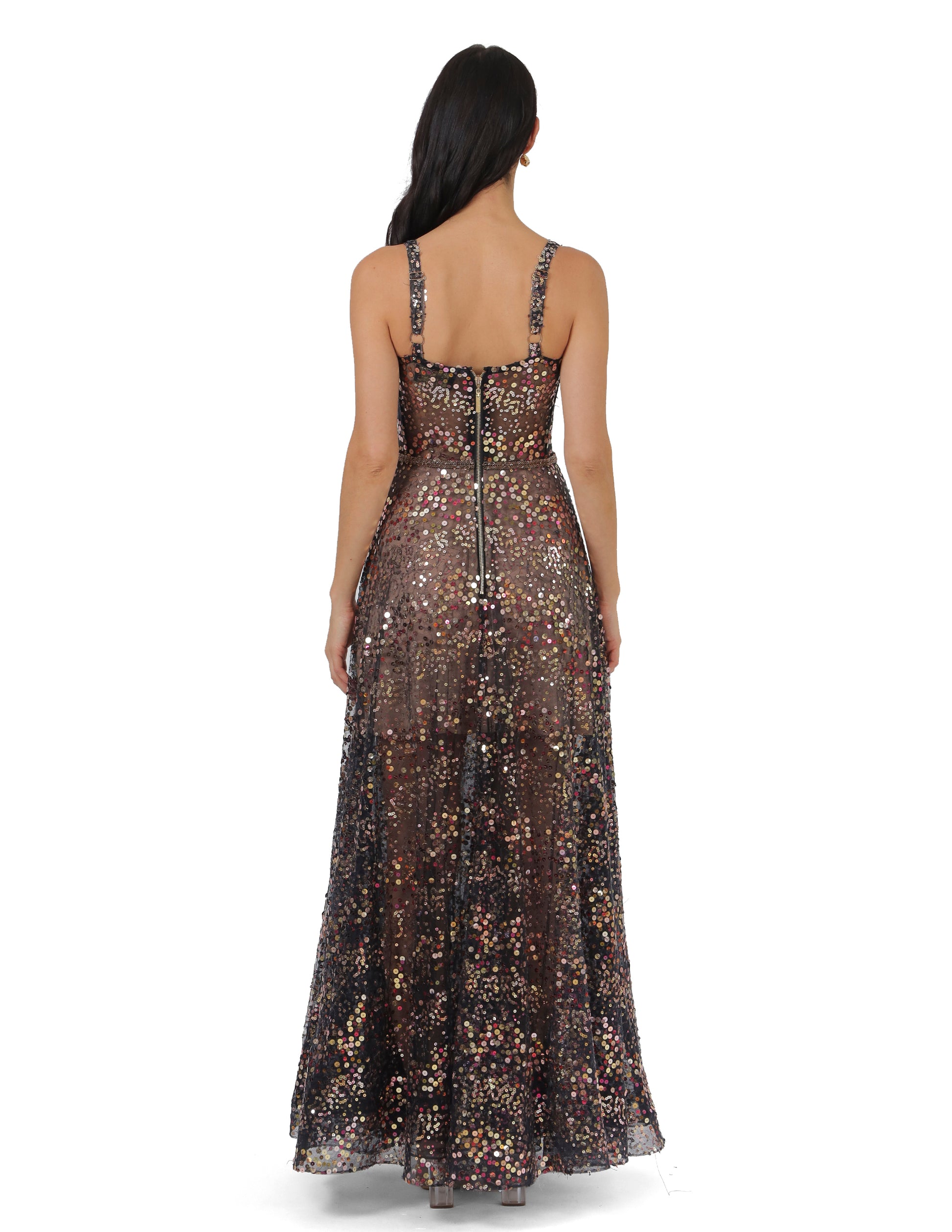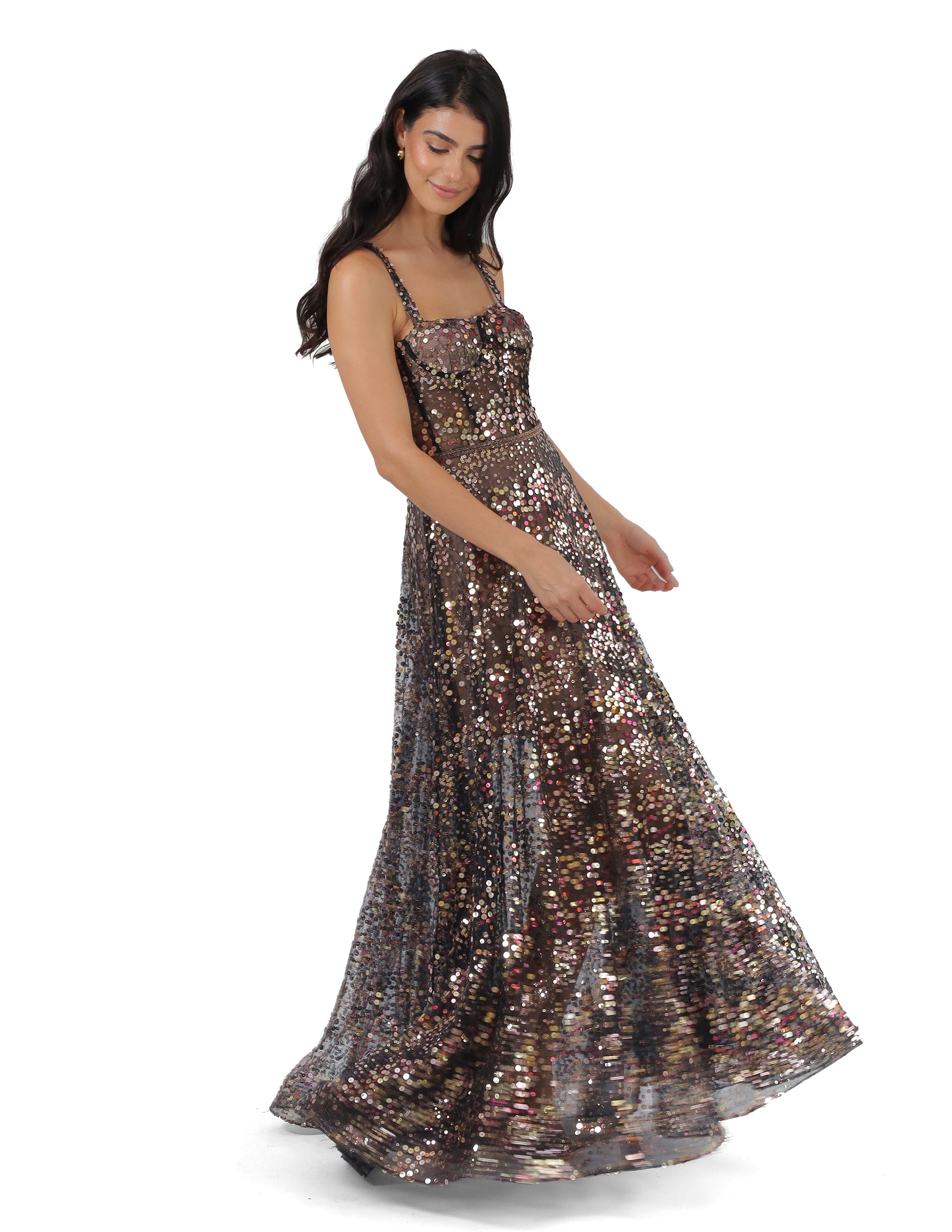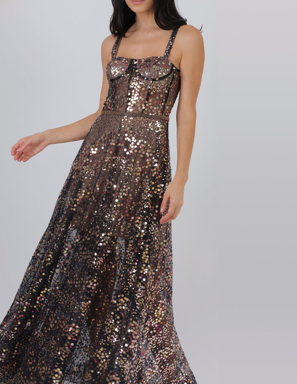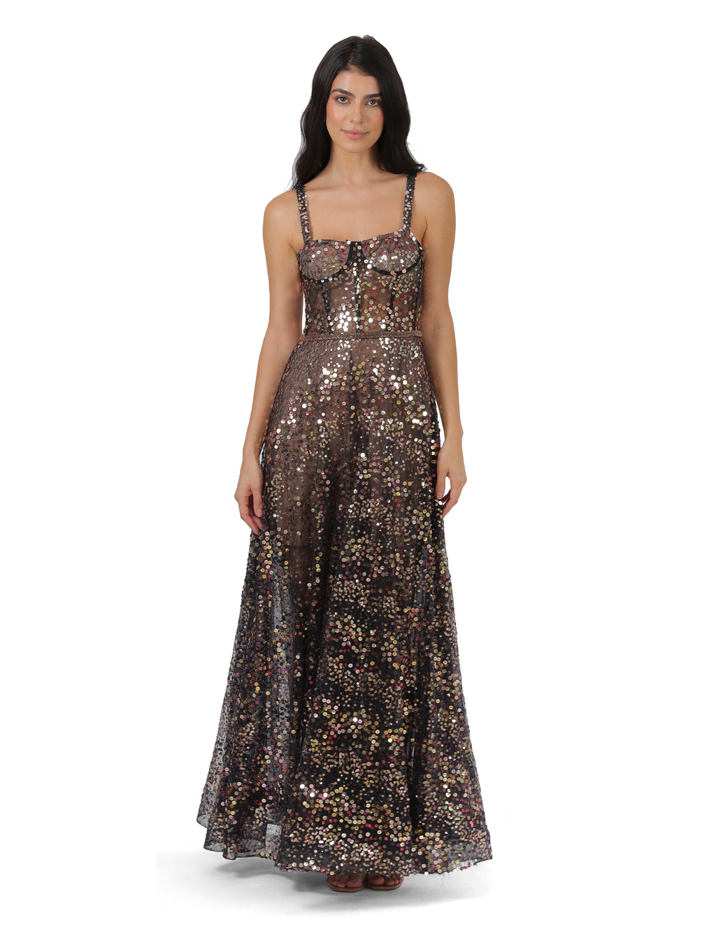 Vestido largo, tirantes, tela rígida tipo lentejuela.
