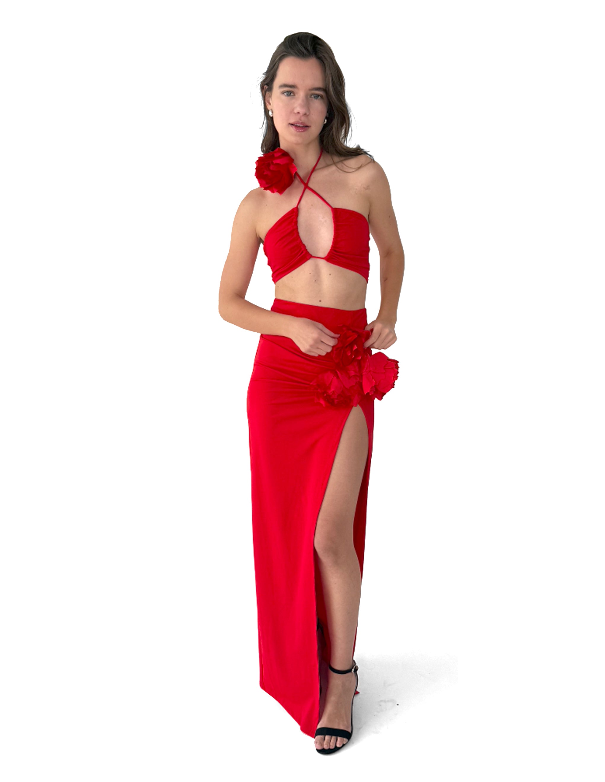Conjunto falda/top, tirantes cruzados, flor en tirante, apertura en pierna, tela stretch.