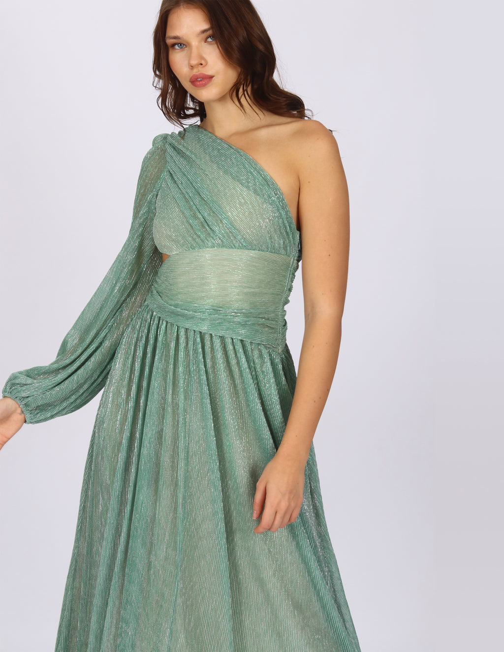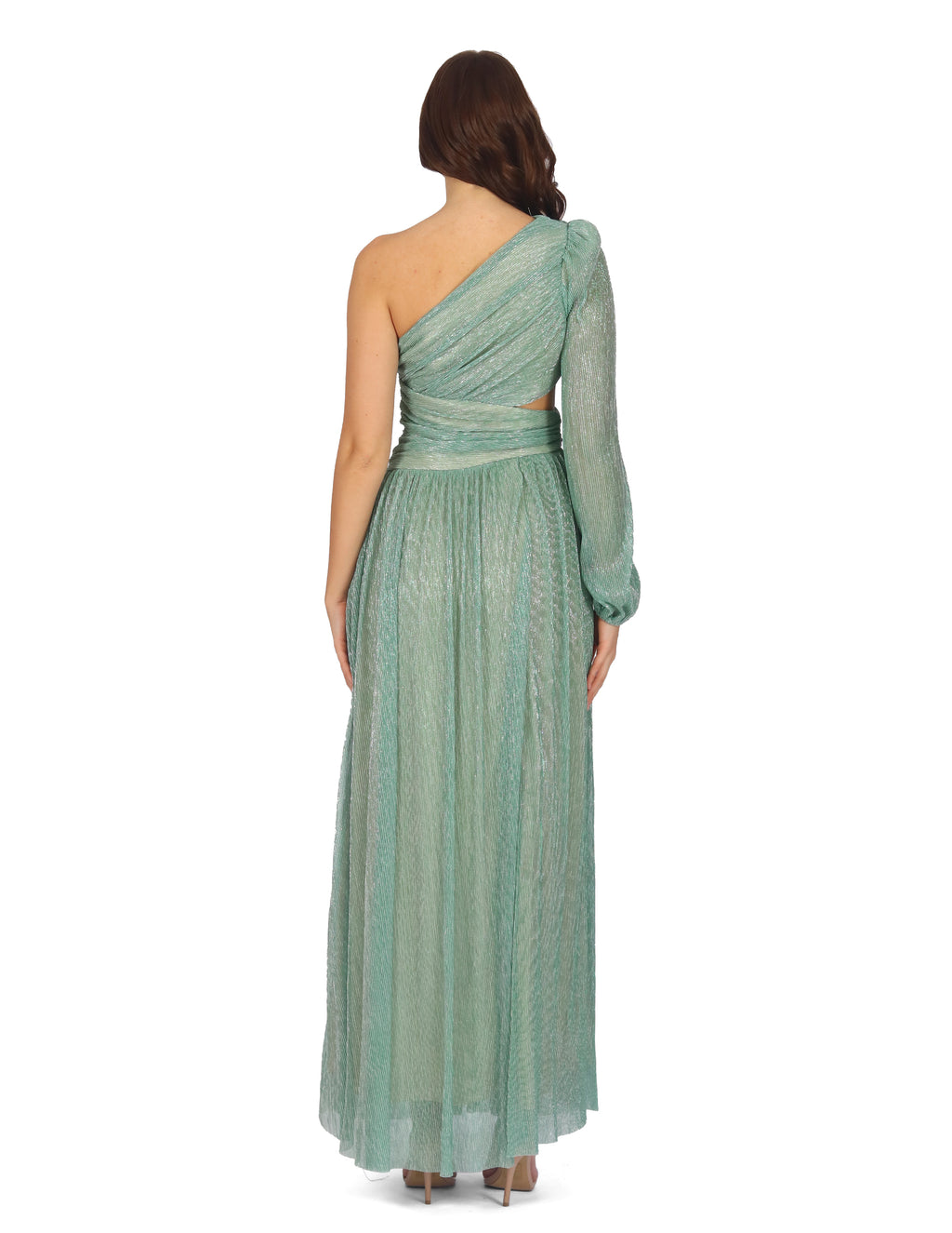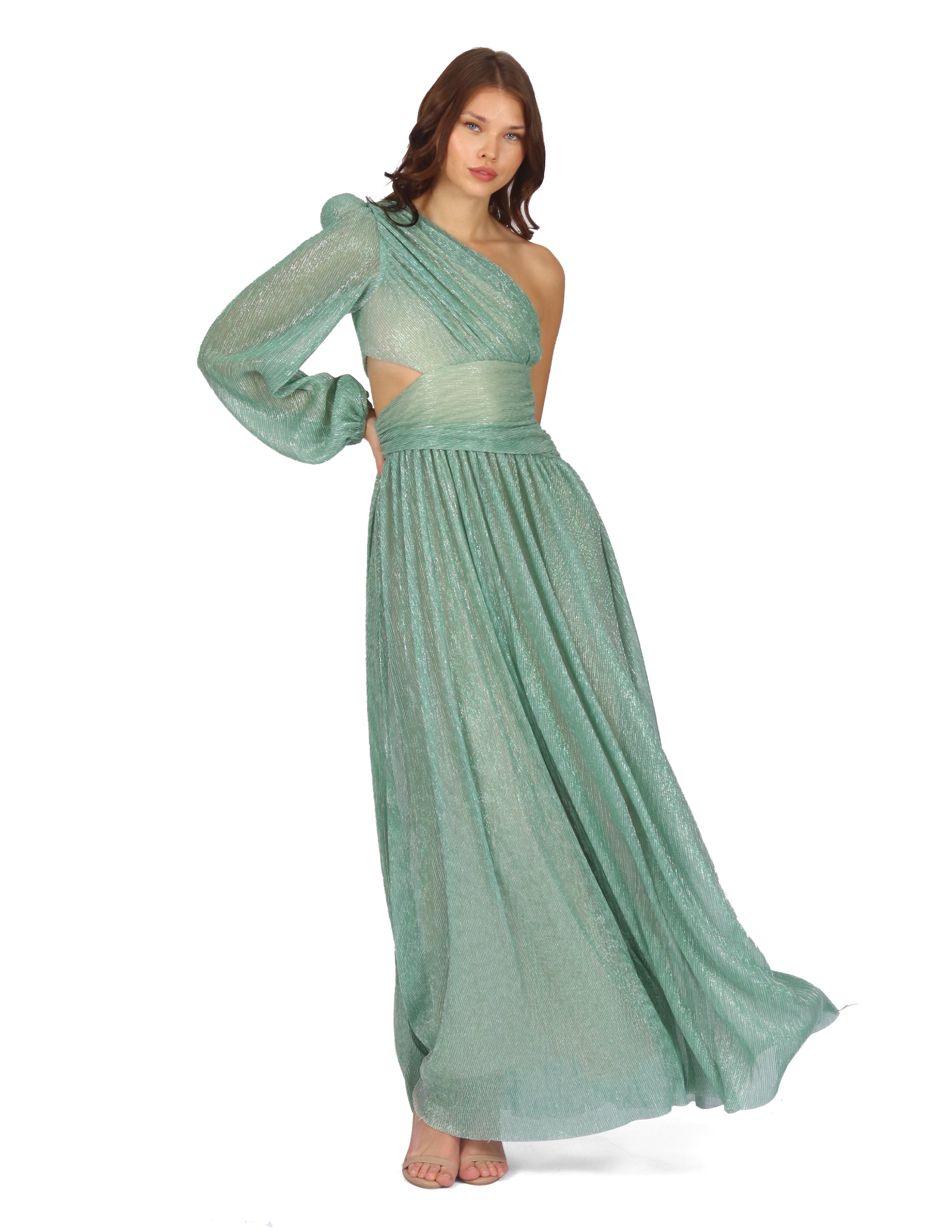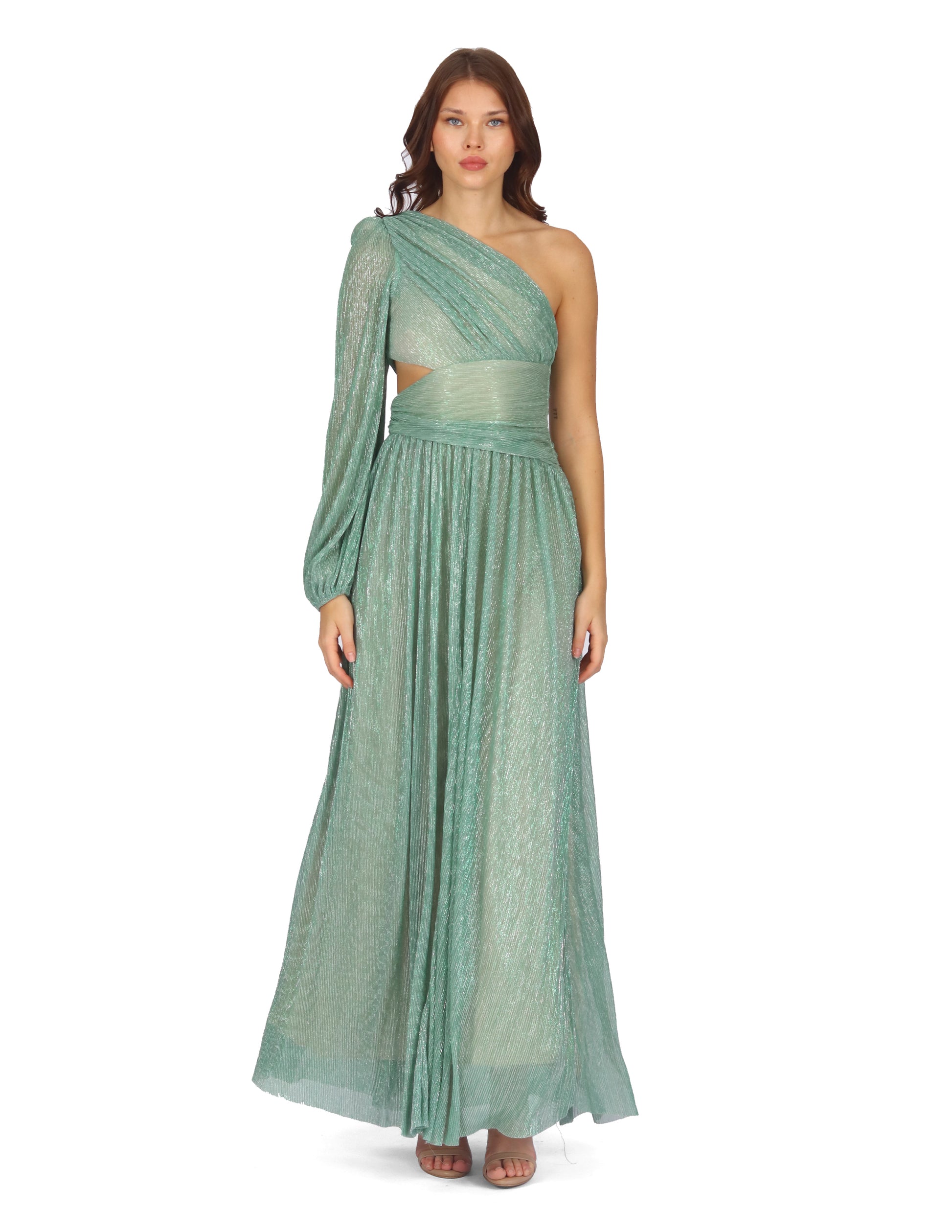 Vestido largo, a un hombro, manga larga, apertura en cintura, tela rígida.