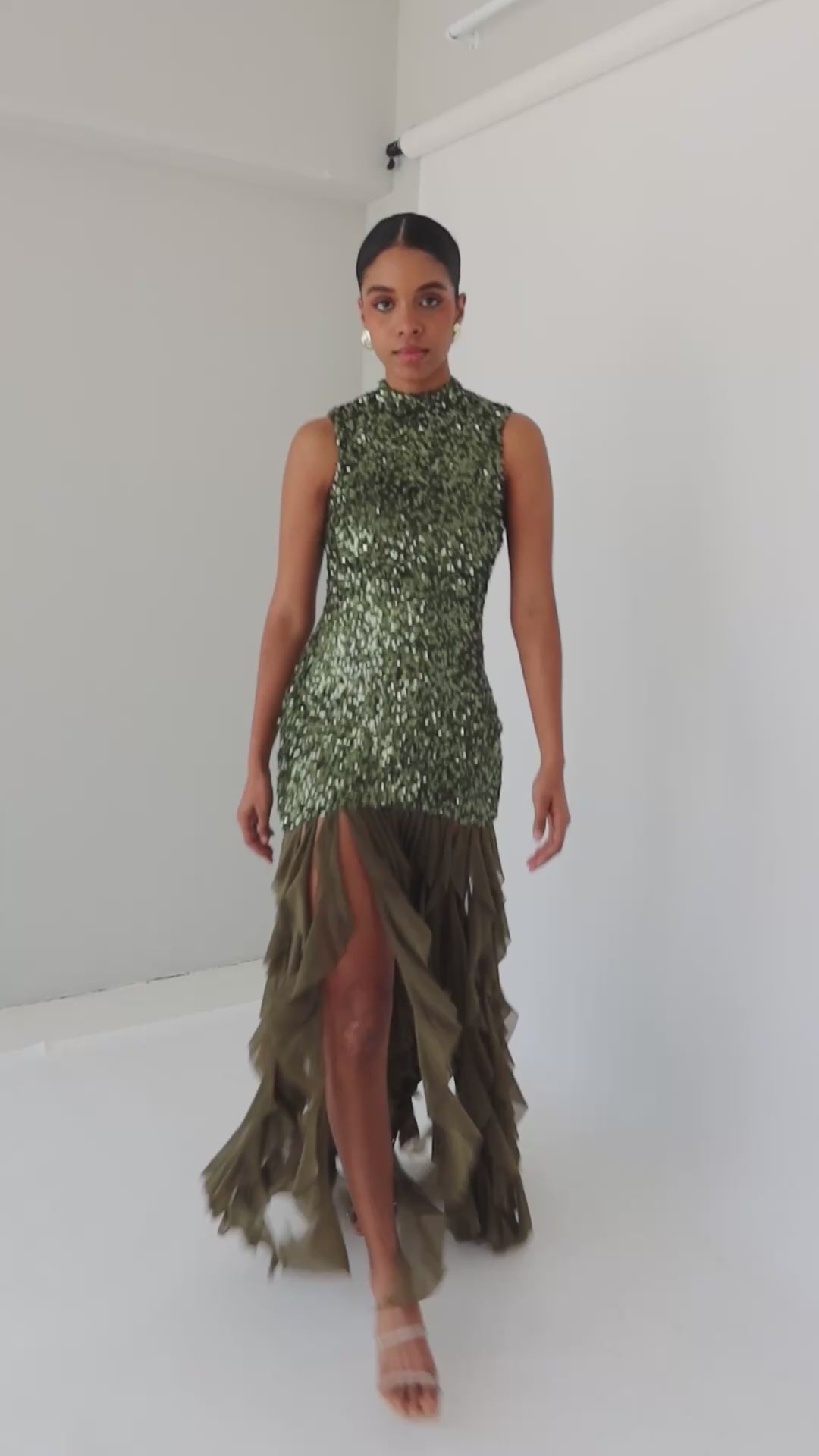 Vestido largo, cuello alto, sin mangas, falda de tiras, tela rigida tipo lentejuela.