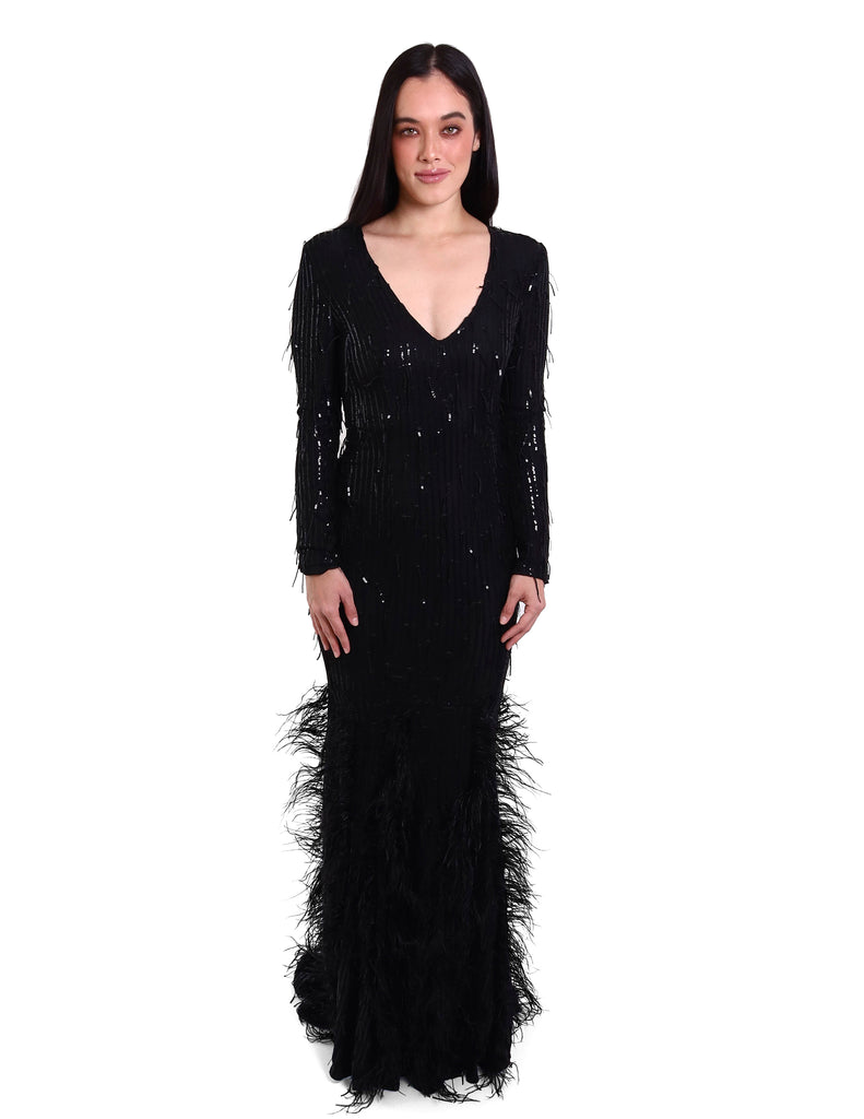 Vestido largo, manga larga, escote en v, plumas en falda, detalle de flecos, tela stretch tipo lentejuela.