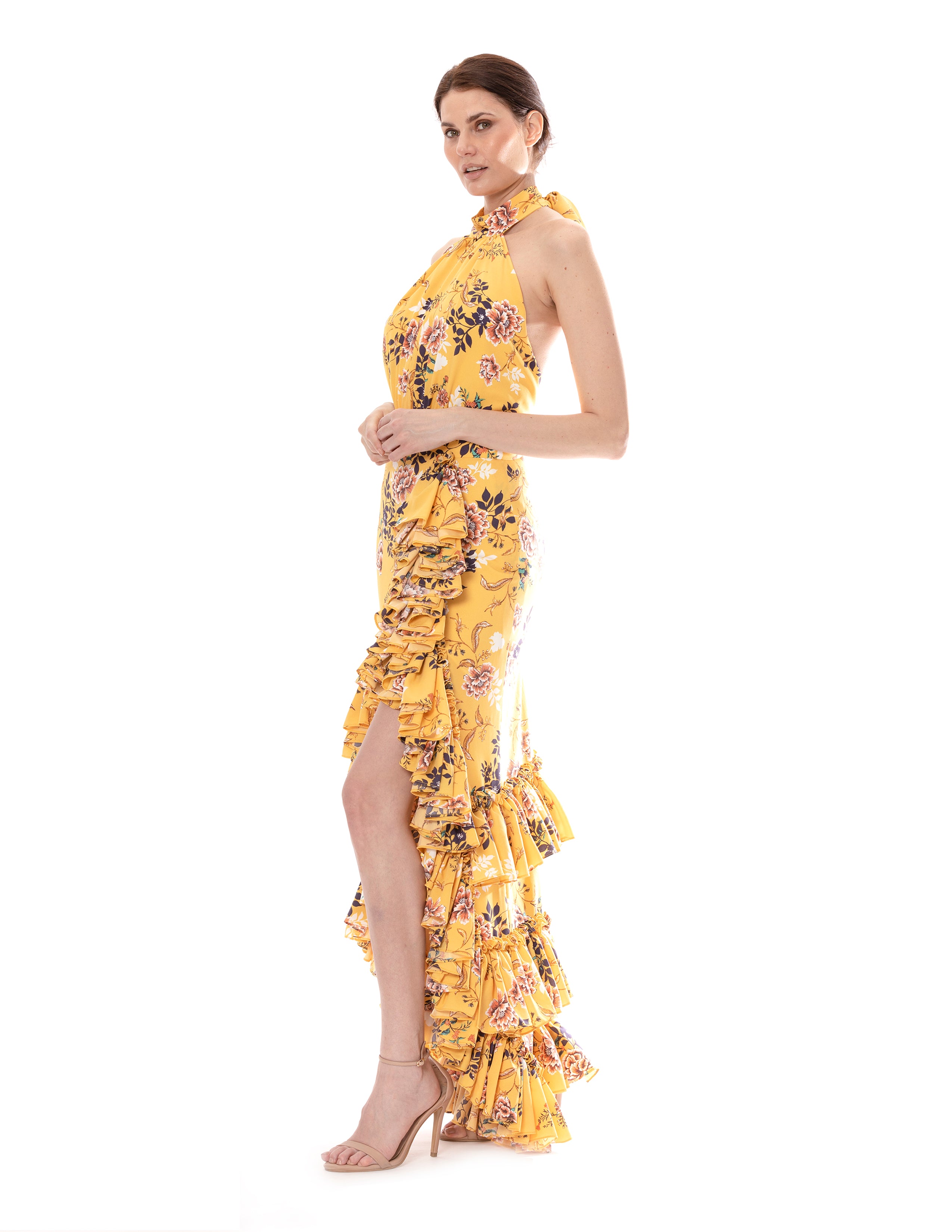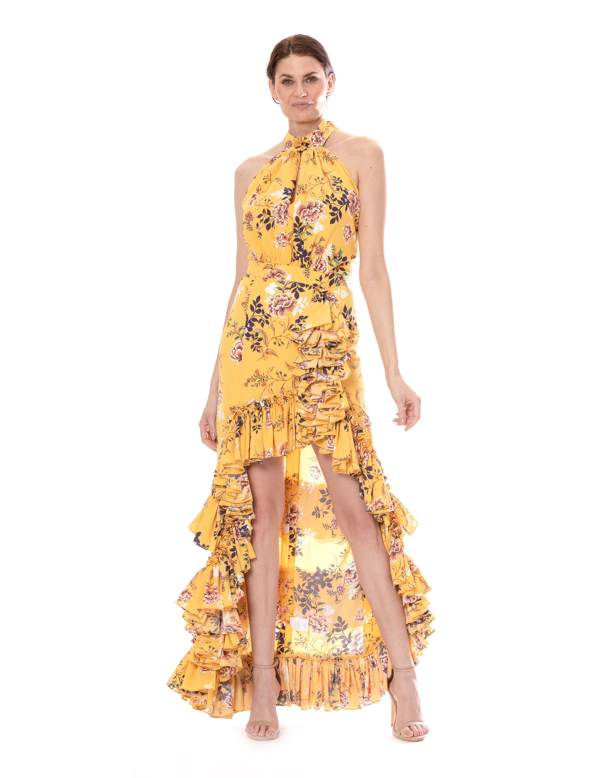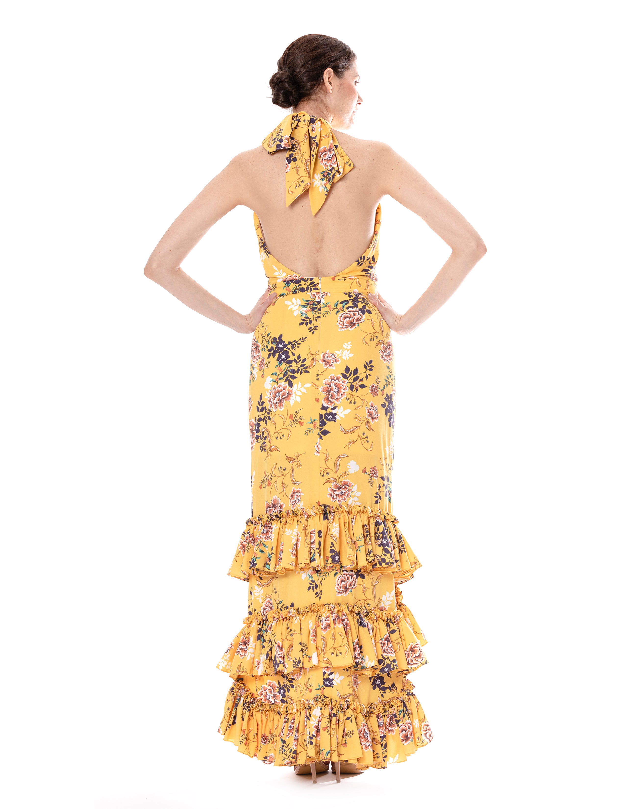 Vestido corto/largo, cuello halter, espalda descubierta, tela rigida.